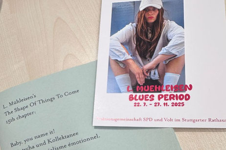Gemeinsam mit Sara Dahme besuchen wir aktuelle Arbeiten von Lisa Mühleisen im Stuttgarter Rathaus und treffen die Künstlerin vor Ort. Lisa Mühleisen ist Malerin und momentan auch die Assistentz von Professor Andreas Opiolka an der ABK Stuttgart. Sie beschäftigt sich in ihren Arbeiten mit dem Medium der Malerei und der Sprache. Ihre aktuelle Werkreihe heißt “Blues Period”.