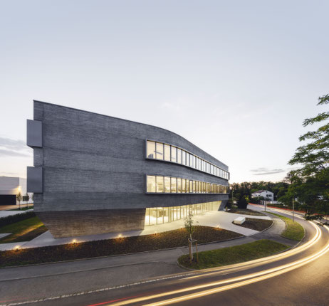 Beim Entwurf des Stuttgarter Architekturbüros a+r spielten die Werkstoffe Beton und Holz eine zentrale Rolle. Die monolithische Außenwand besteht aus 60 cm starkem Leichtbeton - auf Dämmstoffe konnte hierdurch ganz verzichtet werden! Die Arbeitsplätze im Inneren sind als flexibler Open Space konzipiert. Spannend ist auch das Energiekonzept: Das Gebäude wird mittels Wärmepumpe, Rückkühlwerk und unterirdischem Eisspeicher mit Wärme bzw. Kälte versorgt. Auf dem Dach befindet sich zudem eine Photovoltaik-Anlage.